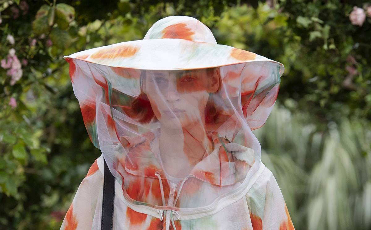 The bee-keeper veiled hats of Felipe Oliveira Baptista’s collection for Kenzo, channelled the designer’s love of nature while their protective qualities also felt timely. Elements such as multi-pocketed jackets and compartmented bags with larger bags hidden inside combined with cocooning outerwear shapes combined futuristic fantasy and functional reality.
