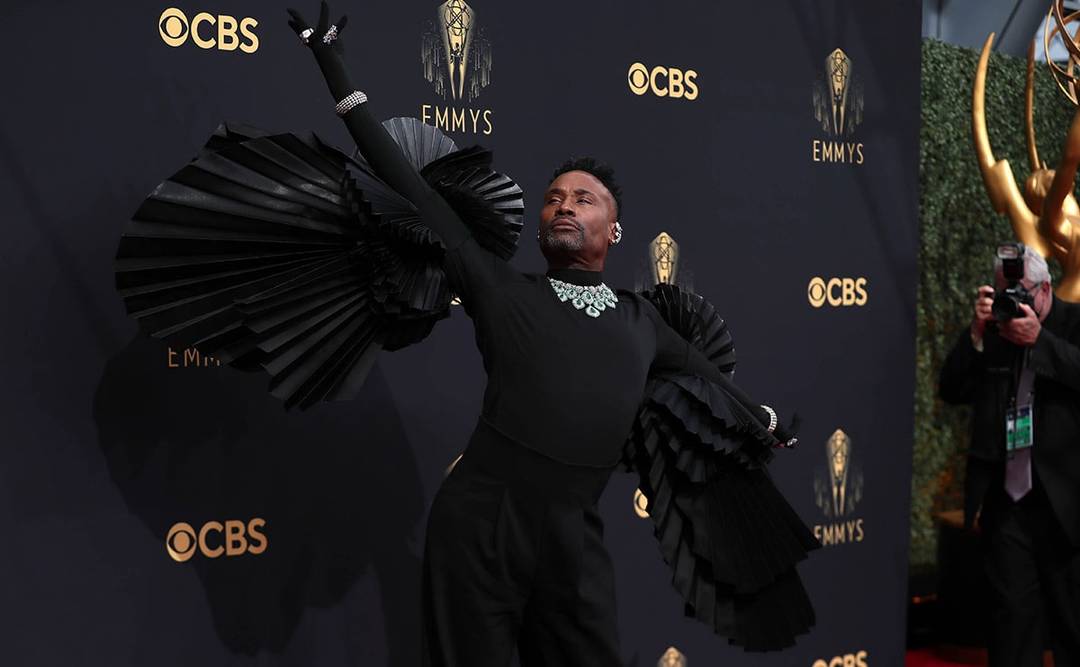 For a long time, men’s fashion was a bit of an afterthought at awards shows, but in recent years, they have brought the drama. “Pose” star Billy Porter, who shut down the Oscars red carpet in 2019 in a Christian Siriano tuxedo gown, slayed once again in a form-fitting Ashi black shirt with giant ruffled flounces on the sleeves, high-waisted trousers – and diamonds galore.